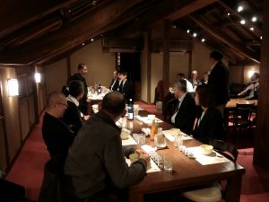見学後は、酒心館内の蔵の料亭「さかばやし」にて懇親会を開催し、酒心館のお酒を堪能しながら参加者同士で意見交換を行いました。関係機関のみなさまと親睦を深めるとともに、今後の産学連携の可能性について情報共有する有意義な時間となりました。ご多忙の中ご参加いただいたみなさまに心より御礼申し上げます。