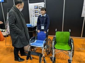 成長産業技術者教育プログラム(医療分野)を履修している学生の取り組みとして、車椅子利用時の姿勢保持を補助する器具の試作例を展示しました。
