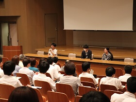 5月25日(土)、編入生見学会を開催しました。希望学科の見学会を行った後、高い求人倍率と幅広い就職先などの全体説明と在校する編入生との座談会が行われました。座談会では、合格のための勉強法も熱心に話されていました。学科見学では、設備などが紹介されました。(広報委員)