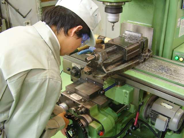 1~2年生では機械製作における作業を実習,体験することにより,加工の原理,方法,加工条件と加工現象,精度の関係などについて理解します。機械工作の基本作業(旋盤,フライス盤,研削盤,鋳造,溶接,NCフライス盤,分解組立)を行うことにより,各種加工法について,また工具の名称,用途などを学べます。また,電気実習では基本作業を中心にハンダ付け,各種測定器具の使用方法を学びます。
