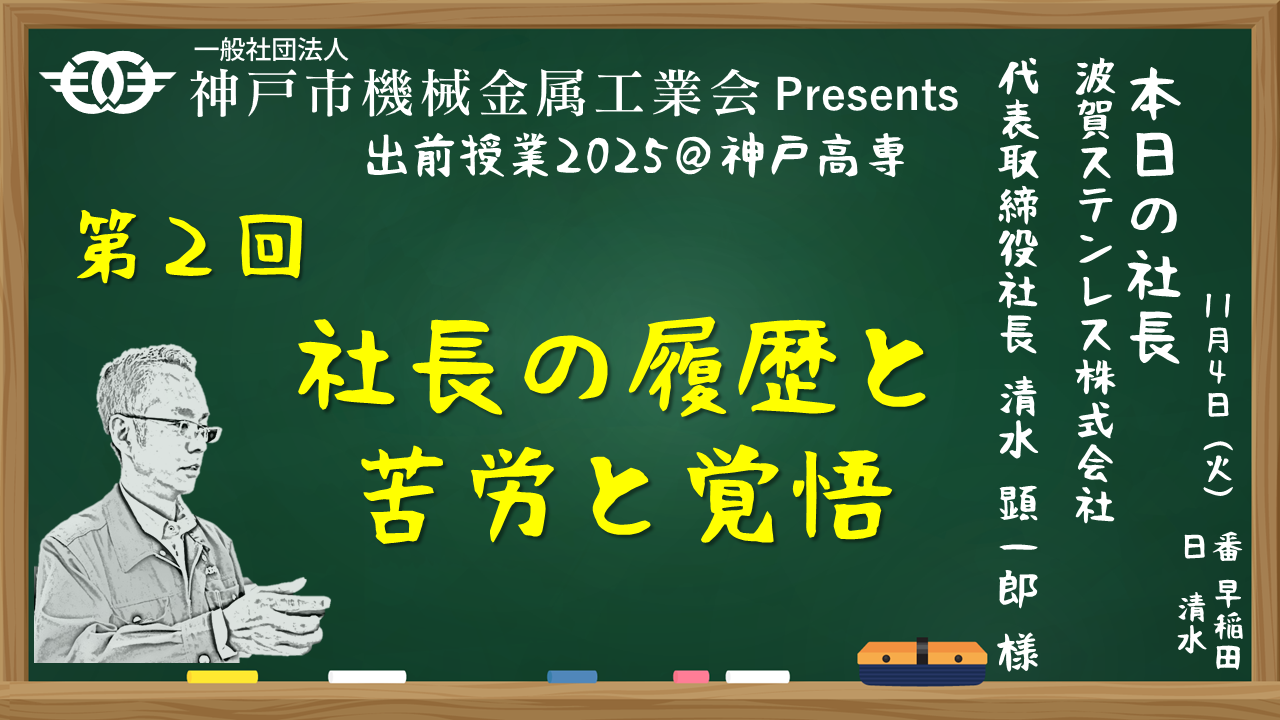 神戸市機械金属会所属企業の名物(?)社長たちの講話企画です。”どうして社長になったの?””会社を起業したきっかけは?””会社経営してみてのしくじりは?”など”ためになる!楽しい!面白い!”お話を提供していただいています。