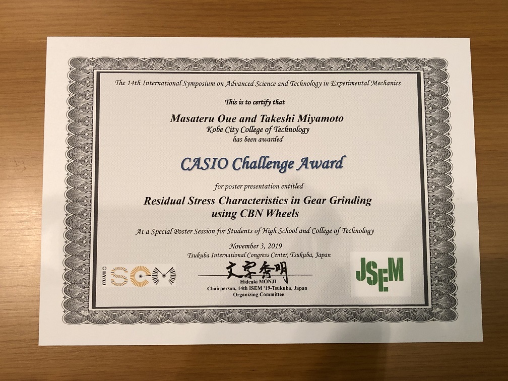 機械システム工学専攻2年 大植祐輝さんがポスター発表で優秀賞CASIO Challenge Awardを受賞しました.(2019年11月)。