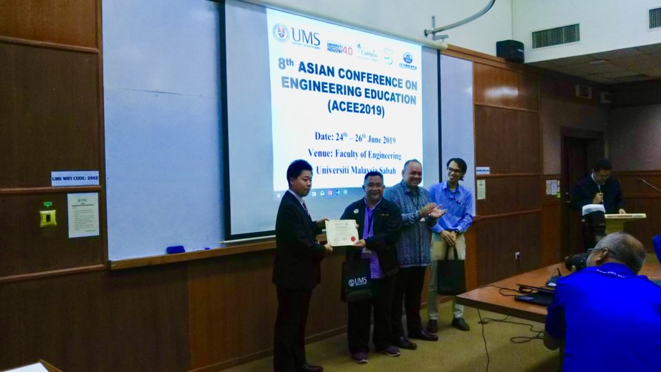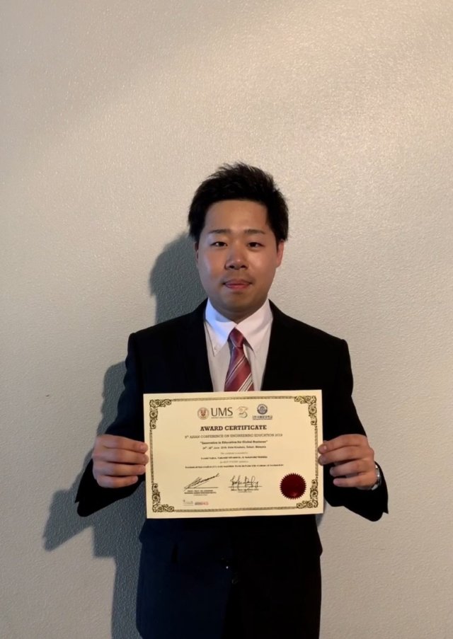 2019/6/24~26にUMS(Universiti Malaysia Sabah マレーシア サバ大学)で開催された”工学教育に関するアジア会議,ACEE2019”にて機械システム工学専攻1年の平 光稀さんがベストプレゼンテーション賞を受賞しました(発表題目:Technical succession of 5-axis machine tools in Kobe City College of Technology,受賞者:Kouki TAIRA(機械システム工学専攻1年) 共著者 Takeshi MIYAMOTO(神戸高専), Masayuki NISHIDA(神戸高専))。初めての国際会議でしたが、前日の夜中まで練習を続けて、質問にもしっかり答えて、堂々としたすばらしい発表でした。主催者の韓国の教授からも「いい学生をお持ちで,将来が楽しみだ」と、声をかけていただきました。(2019年6月)。