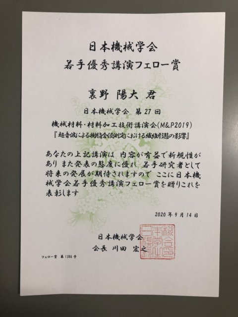 令和元年11月20日~22日に開催された日本機械学会第27回機械材料・機械加工技術講演会 にて「超音波による樹脂含侵測定における繊維形態の影響」というタイトルで発表した機械システム工学専攻 裏野 陽大さんが、若手優秀講演フェロー賞を受賞しました。裏野さん他5名が2019年度の受賞者となりましたが、受賞した学生のほとんどが大学院生であり、この中では最年少(専攻科1年生当時の発表なので大学3回生相当)での見事な受賞でした。表彰式は今年度9月年次大会の予定でしたが、新型コロナウィルスの関係で中止となり、今月に賞をたたえる盾が届きました。おめでとうございます。(2020年10月)。