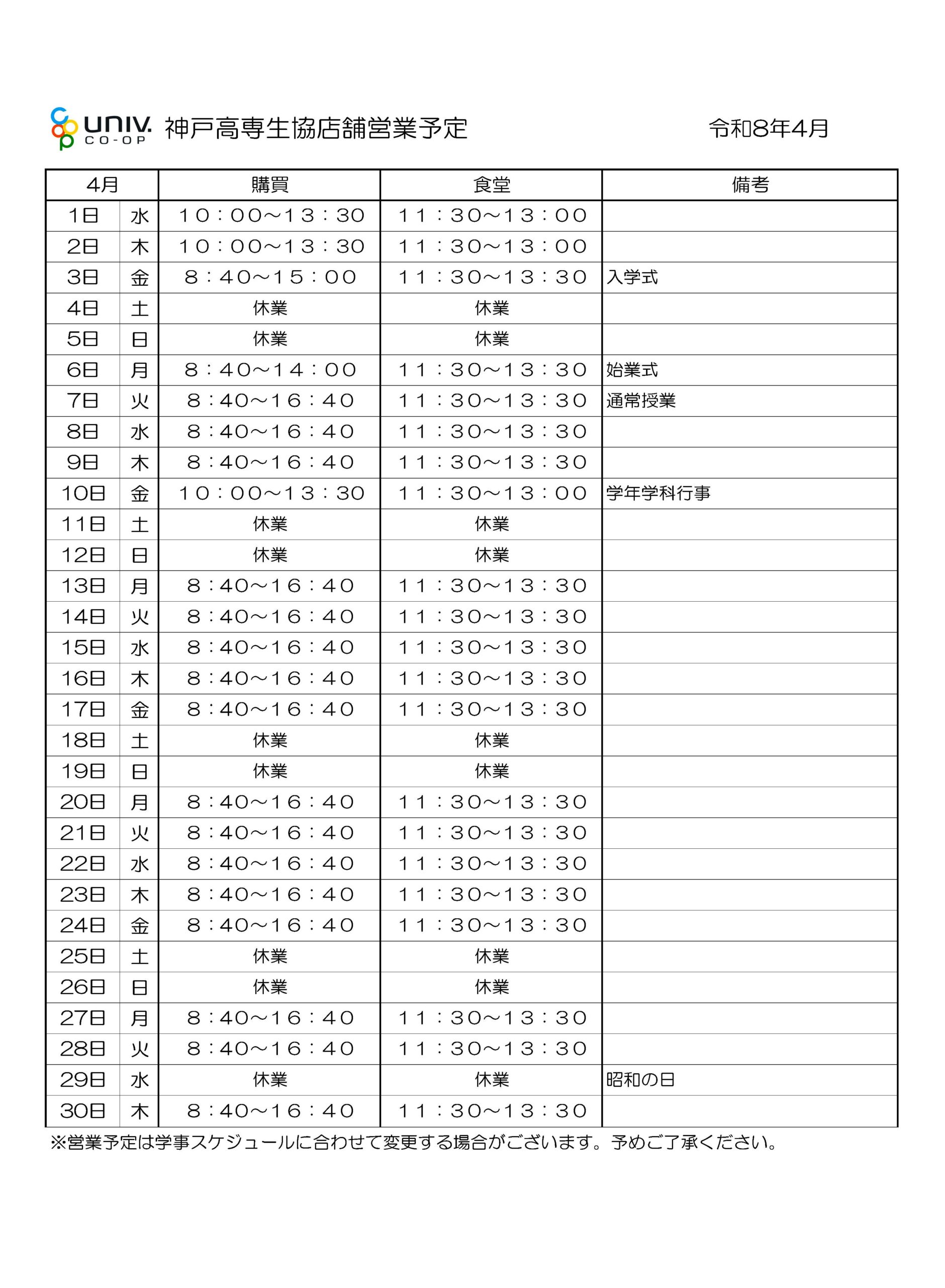 ※学校行事の変更により、営業日程を調整させて頂く場合がございます。